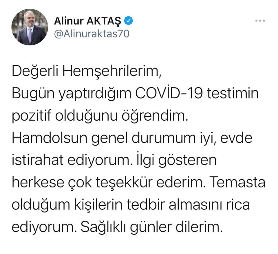 Bursa Büyükşehir Belediye Başkanı Aktaş, sosyal medya hesabından yaptığı açıklamada, “Değerli hemşehrilerim, bugün yaptırdığım COVİD-19 testimin pozitif olduğunu öğrendim. Hamdolsun genel durumum iyi, evde istirahat ediyorum. İlgi gösteren herkese çok teşekkür ederim. Temasta olduğum kişilerin tedbir almasını rica ediyorum. Sağlıklı günler dilerim” dedi.