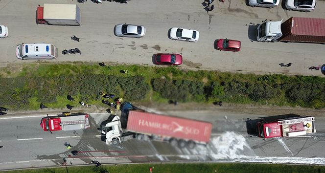 Kaza saat 13.30 sıralarında Orhangazi’de Yeniköy kavşağında meydana geldi. Alınan bilgilere göre Bursa istikametinden Yalova istikametine giden Yakup Işık (38) idaresindeki 16 AHV 969 plakalı sunta yüklü tır Yeniköy kavşağını geçtikten sonra kontrolden çıktı. Virajda devrilen tır yine aynı yönde seyreden ve sürücüsünün kimliği henüz belirlenemeyen 10 SB 690 plakalı bir otomobilin üzerine devrildi. Kaza sonrasında otomobil aniden alev aldı. Vatandaşların ihbarı üzerine olay yerine Bursa Büyükşehir Belediyesi itfaiye ve sağlık ekipleri sevk edildi. Alev alan otomobile ilk müdahaleyi ise çevreden yetişen vatandaşlar yangın tüpleri ile müdahale etti.